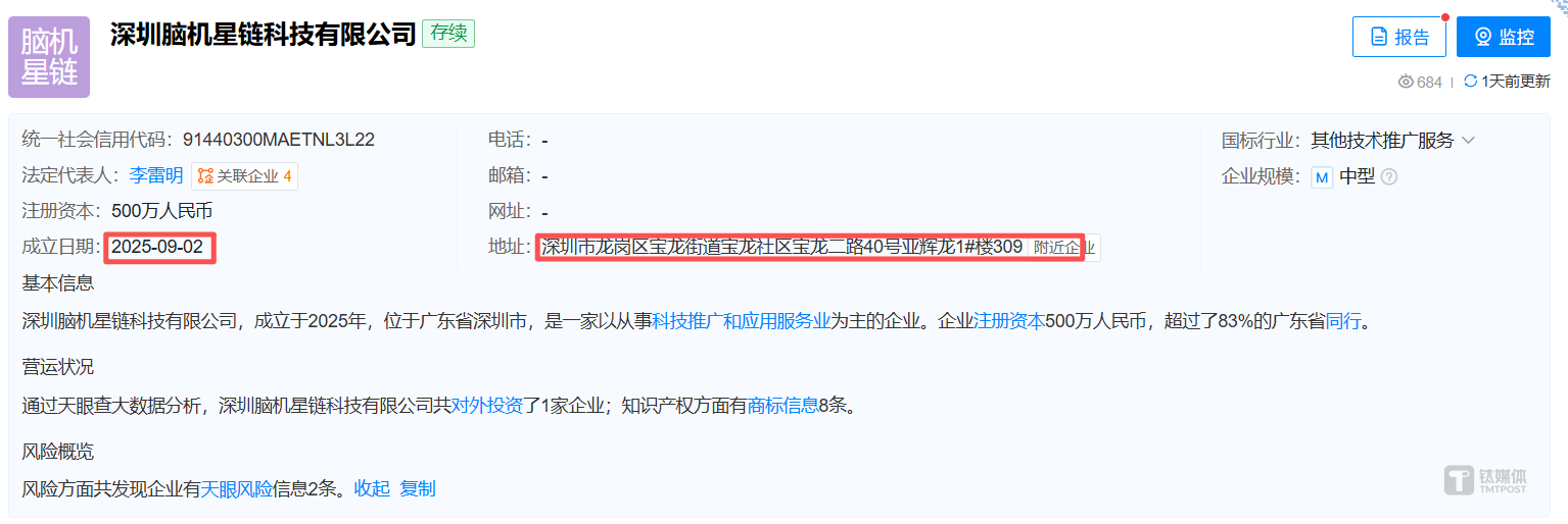 首先,合作方的资质与背景迷雾重重。根据公开信息,此次的战略合作方脑机星链,成立于2025年9月2日。从成立之日到签署战略协议,其间仅隔四个月。