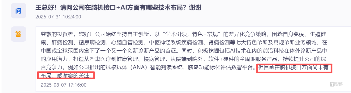 最为关键的是,公司态度的戏剧性反转,精准踩中了概念炒作的时间点。回溯2025年8月,有投资者在互动平台询问亚辉龙在脑机接口领域是否有布局。公司当时的回复明确而干脆:“目前在脑机接口方面尚未有布局。”