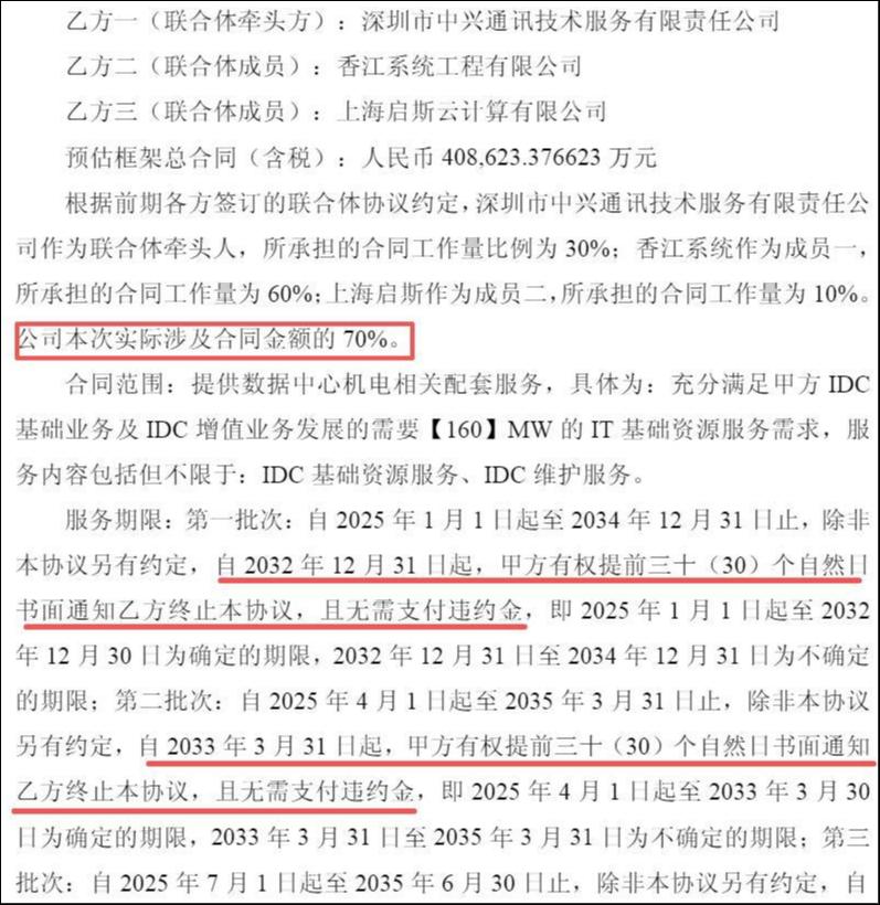 结合《斩获44亿算力大单的B面,城地香江面临收益兑现、资金压力双重拷问》一文,城地香江在部分框架合同中接受了极为苛刻的履约条款,且并非牵头人,这意味着即便承担较高工作量,其利润分成未必占优,却需背负较大风险。加之数据中心建设周期长,从土建、机电安装到设备调试及最终交付运营通常需数年时间,合同履约期漫长且充满不确定性。因此,动辄数十亿元的大单虽具短期市场刺激效应,但业绩兑现难度极大。