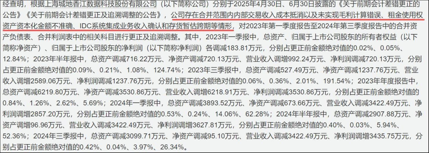 雪上加霜的是,2025年9月,城地香江接连披露两则公告,公司因2023年至2024年共计7份财报信披失真,先后被上交所通报批评,并被上海证监局出具警示函。