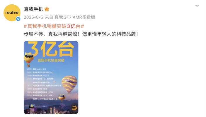 其中在 2025 年 8 月 5 日,在成立七周年之际,realme 还比较高调地宣布,其在全球智能手机市场的累计销量突破 3 亿台,成为全球增长最快的智能手机品牌——在连续六年稳居全球销量 TOP10。
