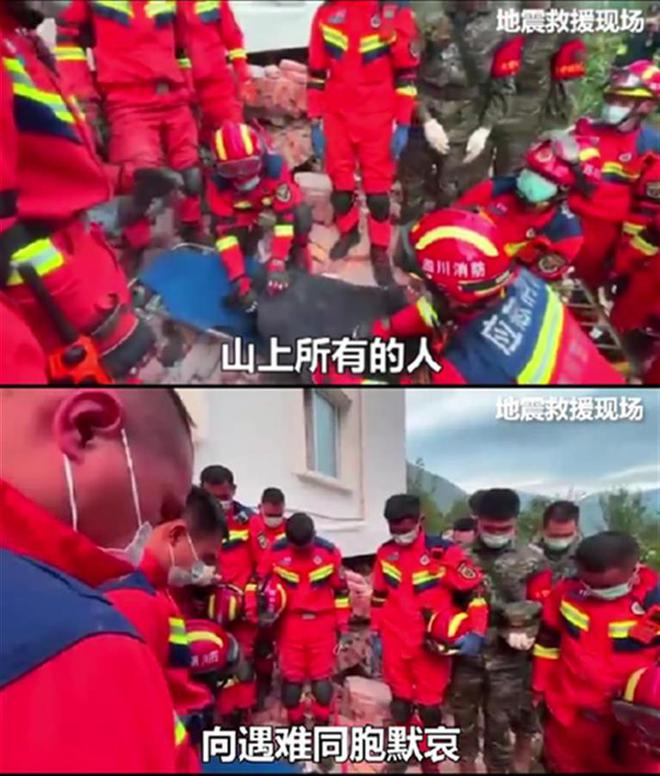 救援人员脱帽向遇难同胞默哀(图片:人民日报)