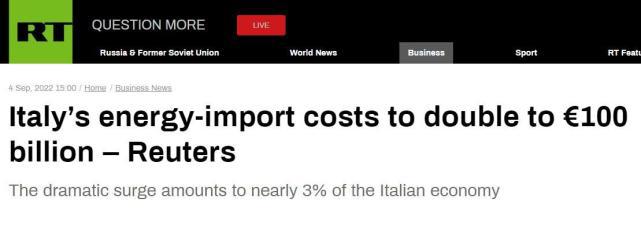 据今日俄罗斯电视台(RT)网站4日报道,路透社3日援引意大利经济部长达尼埃莱·佛朗哥的话称,与去年相比,意大利今年的能源进口成本预计将增加一倍多,达到1000亿欧元。