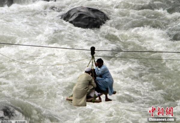 图为巴基斯坦洪灾导致桥梁损毁 民众使用各种方法渡河