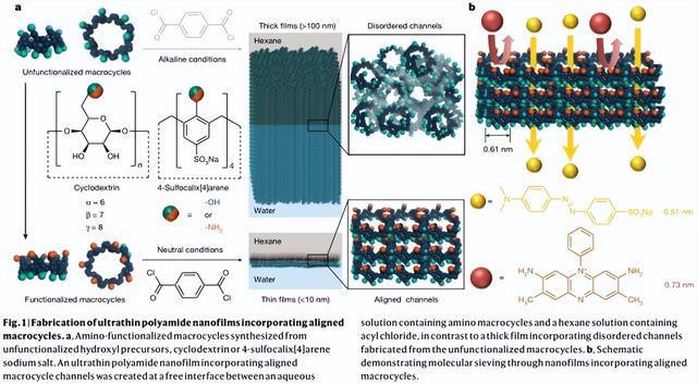 包括共价有机框架(COFs)、金属有机框架(MOFs)和多孔有机笼(POCs)在内的多孔材料,其固有的孔洞/孔径可能转化为膜孔,但以往的研究已经遇到了不可避免的晶界或无序填充的障碍。近年来,具有永久空腔的大环,如环糊精,通过界面聚合被交联成聚酯分离层。这些空腔被认为是保留的固有膜孔。然而,由于未功能化的环糊精的宽边和窄边在碱性条件下都富集了具有类似反应活性的羟基,界面反应过程中发生了随机交联,形成了超过100 nm厚的薄膜(图1a)。在激烈的界面聚合过程中,具有难以区分反应性的胺的大环也倾向于随机反应和堆积。这种非选择性交联降低了大环中相邻的空腔在孔隙中形成对齐的可能性,并解释了小于空腔大小的分子意外的高排斥。从本质上讲,均匀的大环空腔尺寸并没有转化为在不同溶质之间实现尖锐选择性所需的均匀膜孔径。