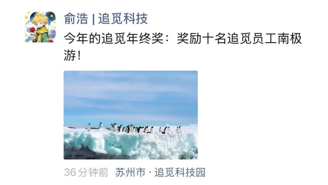 俞浩在朋友圈宣布年终奖追加南极游,图/俞浩朋友圈